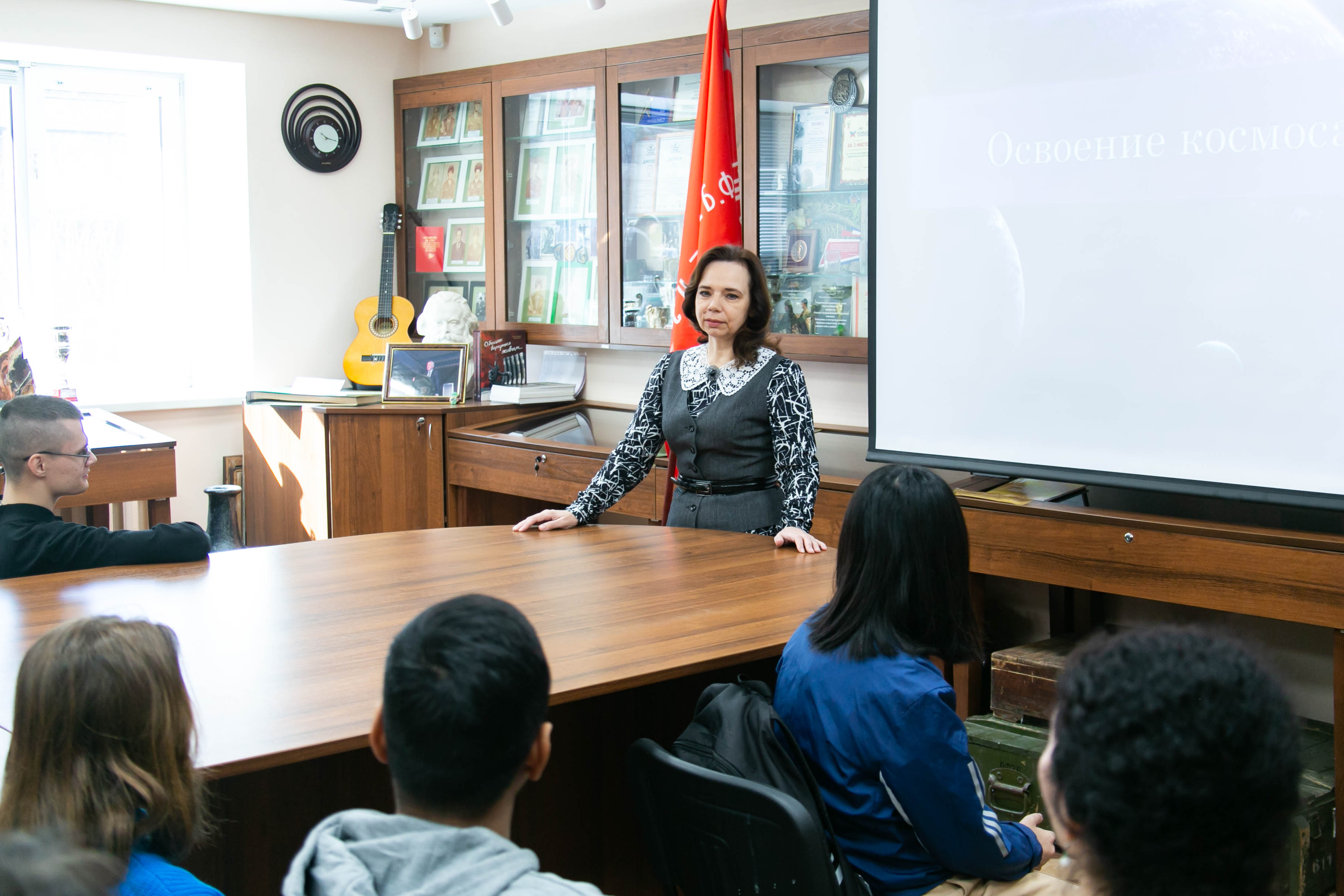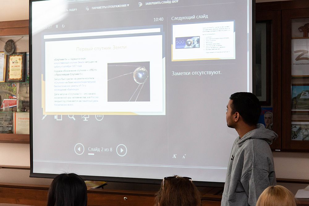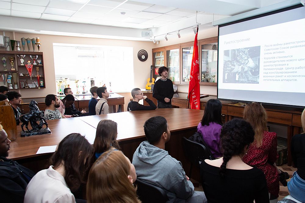 На регулярной встрече студентов в Музее истории УрГЭУ выступили 8 обучающихся на подготовительном факультете ребят из Вьетнама, Индии, Анголы, Египта и других стран. Ребята подготовили презентации о советских ученых–разработчиках космических летательных аппаратов и спутников и о космонавтах, чьи имена знает весь мир.