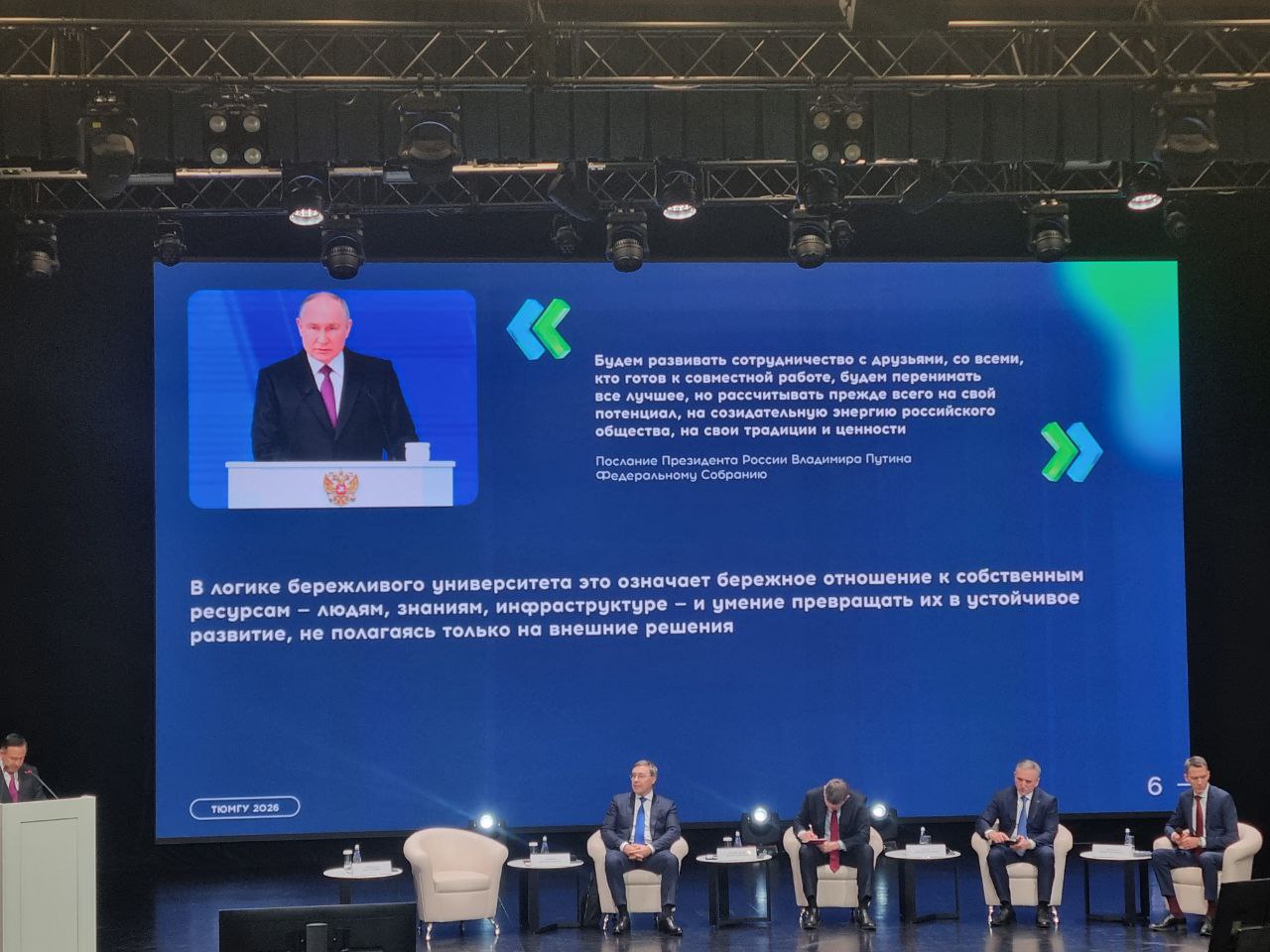 On January 30, a plenary session on labor productivity in higher education institutions of the Russian Federation was held. Valery Falkov, Minister of Science and Higher Education, and Maxim Reshetnikov, Minister of Economic Development of the Russian Federation, addressed the participants. Alexander Moore, Governor of the Tyumen Region, presented the results of the region's five-year work on participation in the federal Labor Productivity project. Rectors of MIPT Dmitry Livanov, UrFU Ilya Obabkov, Volga State Technological University Igor Petukhov, TSU Ivan Romanchuk presented the experience of implementing projects to increase labor productivity through optimization of such internal university processes as workload planning and scheduling, organization of student dormitories, campus development, and workflow optimization.