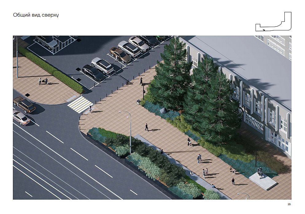 As reported by the USUE Property Complex Development Department, the improvement plan includes replacing sidewalks and asphalt pavement, installing benches for rest in front of the main entrance to USUE and near the metro station, lighting the fir trees and the monument to Pyotr Stolypin. Bicycle paths and green spaces will appear: spruce, pine, juniper, apple, willow, spirea. Automatic watering will be installed.